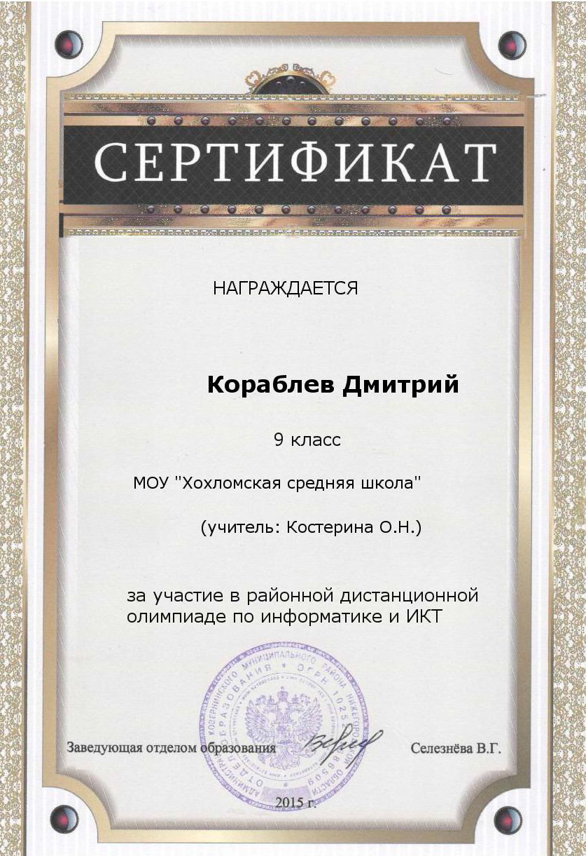 В начале февраля 2015 года в Ковернинском районе по всем школам проходила дистанционная олимпиада по информатике и ИКТ. Из нашей школы принимало участие в этой олимпиаде 3 учащихся: Кораблев Дмитрий 9 класс, Тимачев Кирилл 7 класс, Шипкова Светлана 7 класс. Призовых мест ребята не заняли, но они очень старались и получили сертификаты за участие.